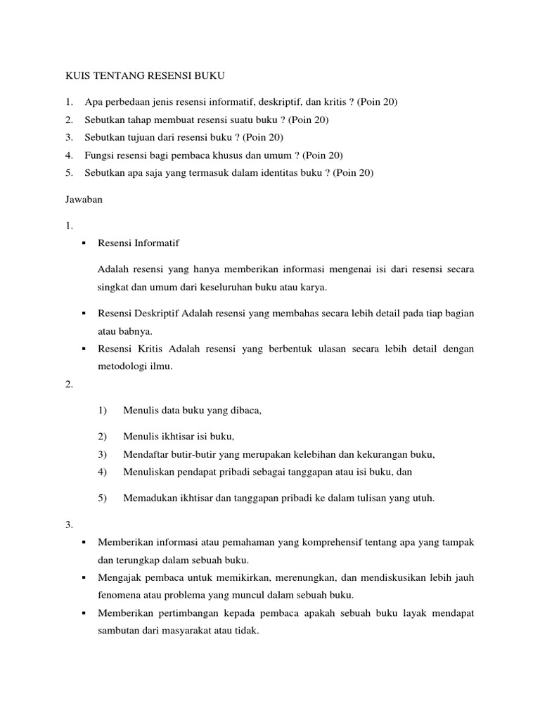 Soal dan jawaban resensi. D Pada bagian penutup resensi buku seharusnya memberikan informasi atau pemahaman yang komprehensif tentang apa yang tampak dan terungkap dalam sebuah buku. Banyak buku lain yang memuat tulisan para anggota Forum Lingkar Pena FLP baik di pusat maupun di daerah-daerah. Indonesia semester genap kelas 11 bagian ke 5 soal nomor 41 50 dengan materi yang sama yaitu soal tentang menilai karya melalui resensi yang diambil dari bab 3.