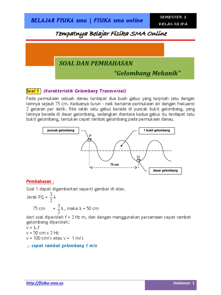 Soal dan jawaban gelombang mekanik. Dari soal diperoleh f 2 Hz m dan dengan menggunakan persamaan cepat rambat gelombang diperoleh. V lf v 50 cm x 2 Hz v 100 cms atau v 1 ms cepat rambat gelombang 1 ms SOAL DAN PEMBAHASAN Gelombang Mekanik puncak gelombang 1 bukit gelombang dasar gelombang P Q 75 cm. Gelombang mekanik frekuensi periode panjang gelombang cepat rambat Pembahasan soal dan jawaban UN Fisika SMAMA 2013.
