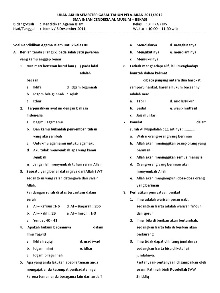 Soal Uas Pai Sma Smk Kelas Xii Semester 1 Gasal